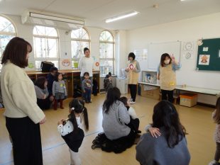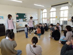 今回は、1月ならではの「アンパンマンの福笑い」をしました。皆大好きなアンパンマンの顔を上手に作れるかな。他にもストップゲームや〇✕クイズをしました。