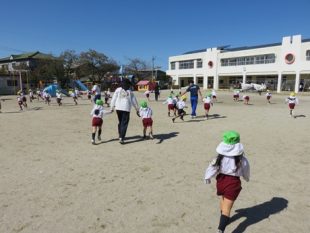 9月前半は残暑が厳しく戸外での活動が思うように出来ませんでしたが、ようやく秋らしくなり戸外で運動会の練習も出来るようになりました。運動会の練習ももちろん行っていますが、他にも避難訓練・縦割り給食等、色々な活動に取り組みました。