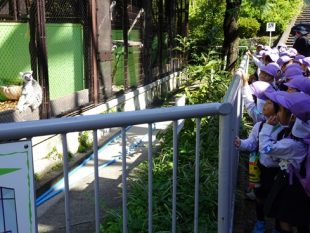 朝、曇っていましたが現地に着いた頃には太陽も顔を出し過ごしやすいお天気の中、年長組のお友達がお別れ遠足を楽しんできました。動物園では沢山の動物が次から次へと現れ大興奮の子ども達。細かいところまでよく見ており、近くの子と話しながら歩いていました。